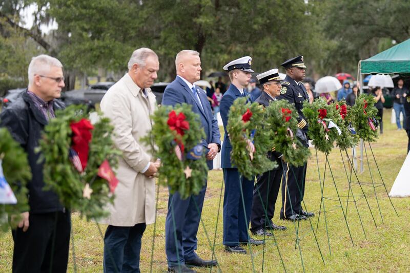 City of Orlando officials and residents gathered in the rain at Greenwood Cemetery to lay wreaths on the graves of local veterans.