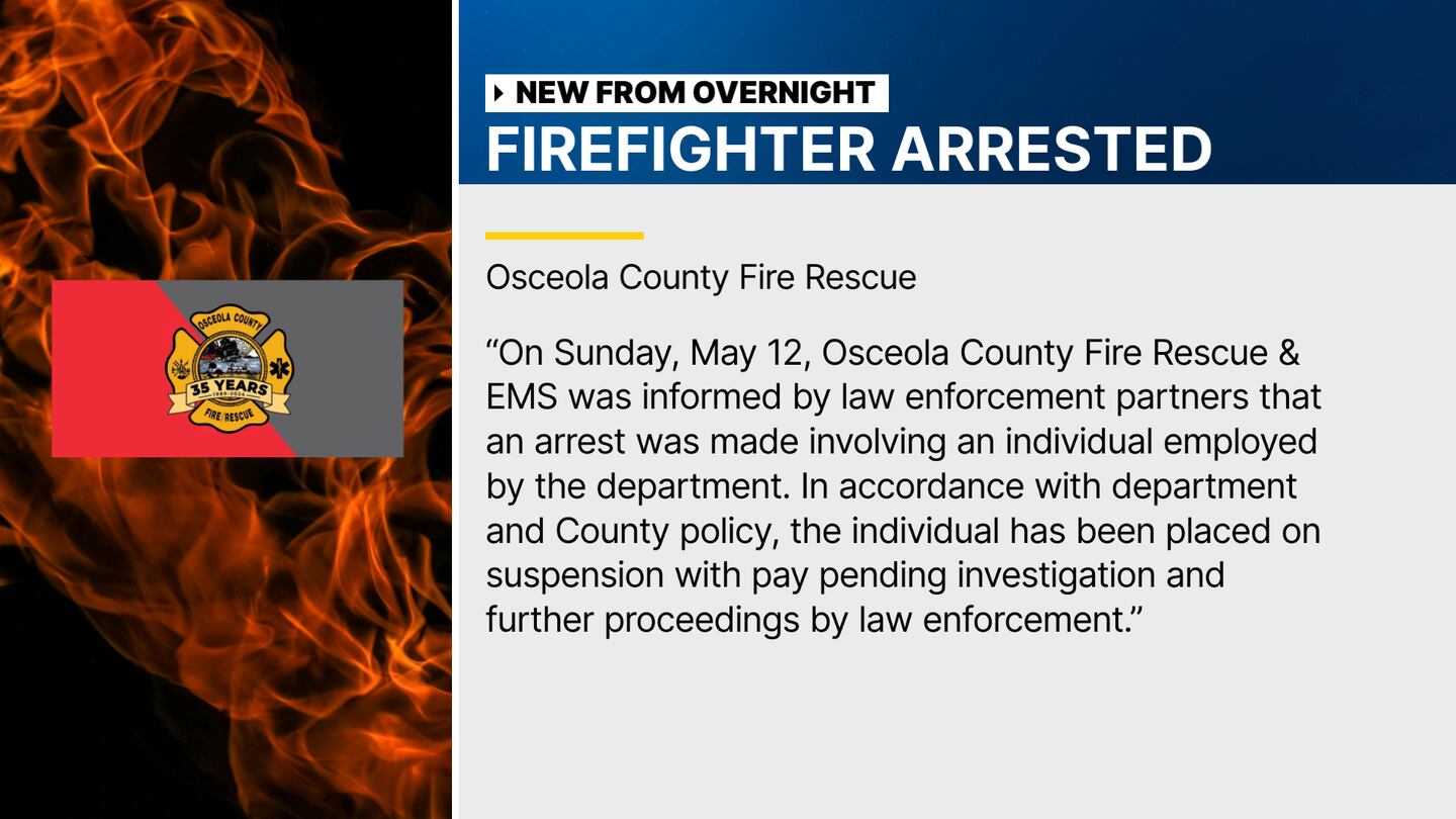 “On Sunday, May 12, Osceola County Fire Rescue & EMS was informed by law enforcement partners that an arrest was made involving an individual employed by the department. In accordance with department and County policy, the individual has been placed on suspension with pay pending investigation and further proceedings by law enforcement.”