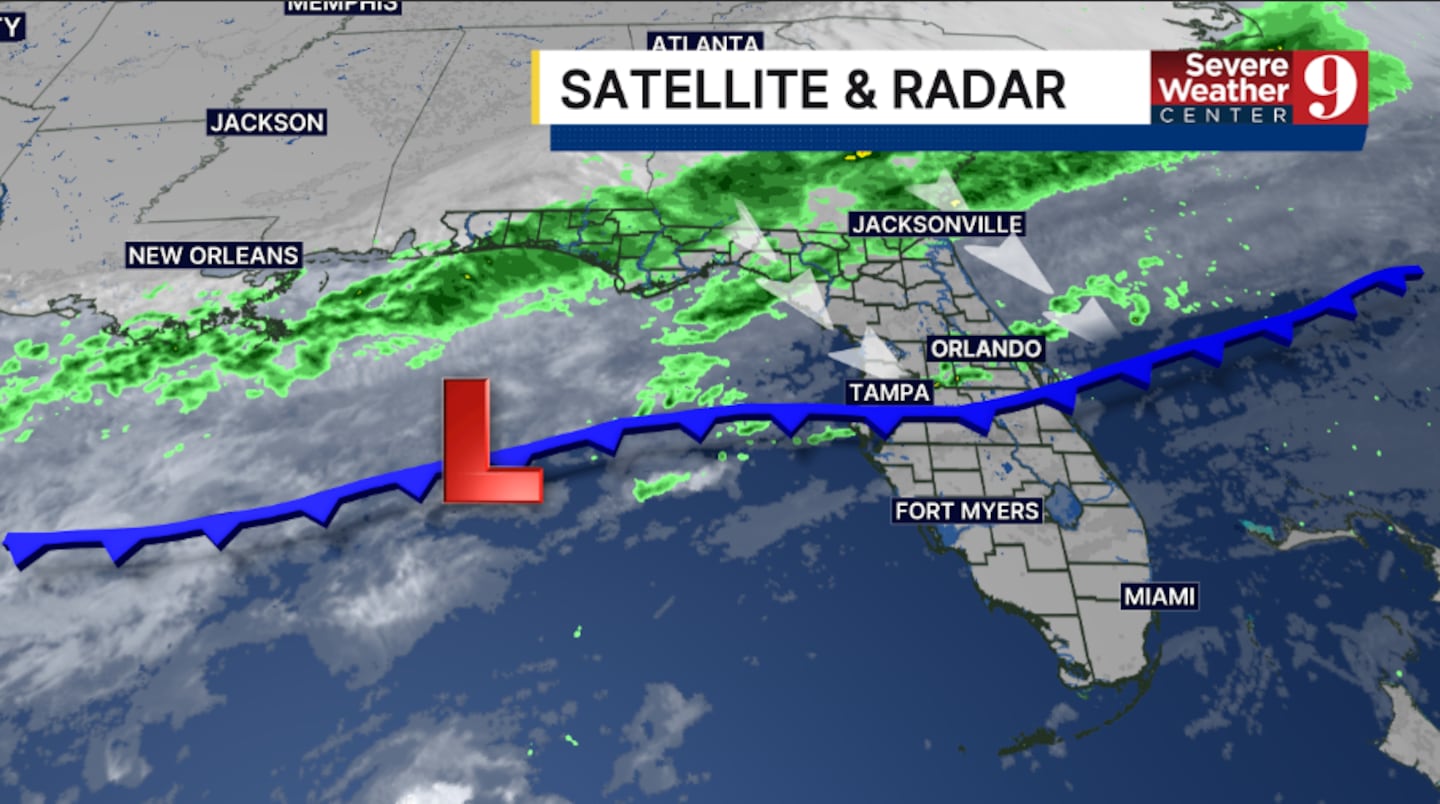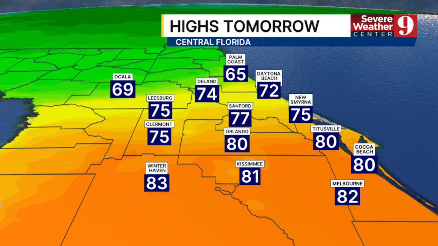 A cold front is draped across the area, and this will lead to scattered showers this evening and tonight. The best chance for activity will be north of Orlando, with lows in the mid-60s.