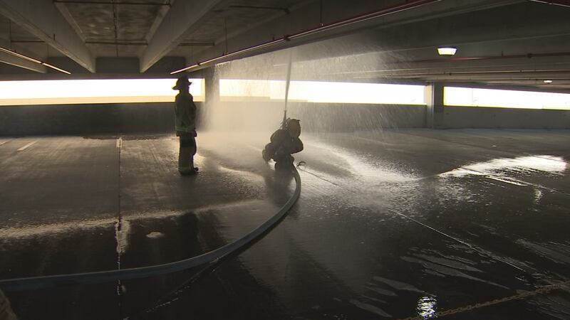 They carried heavy equipment up the garage’s stairwell and practiced operating fire hoses inside.