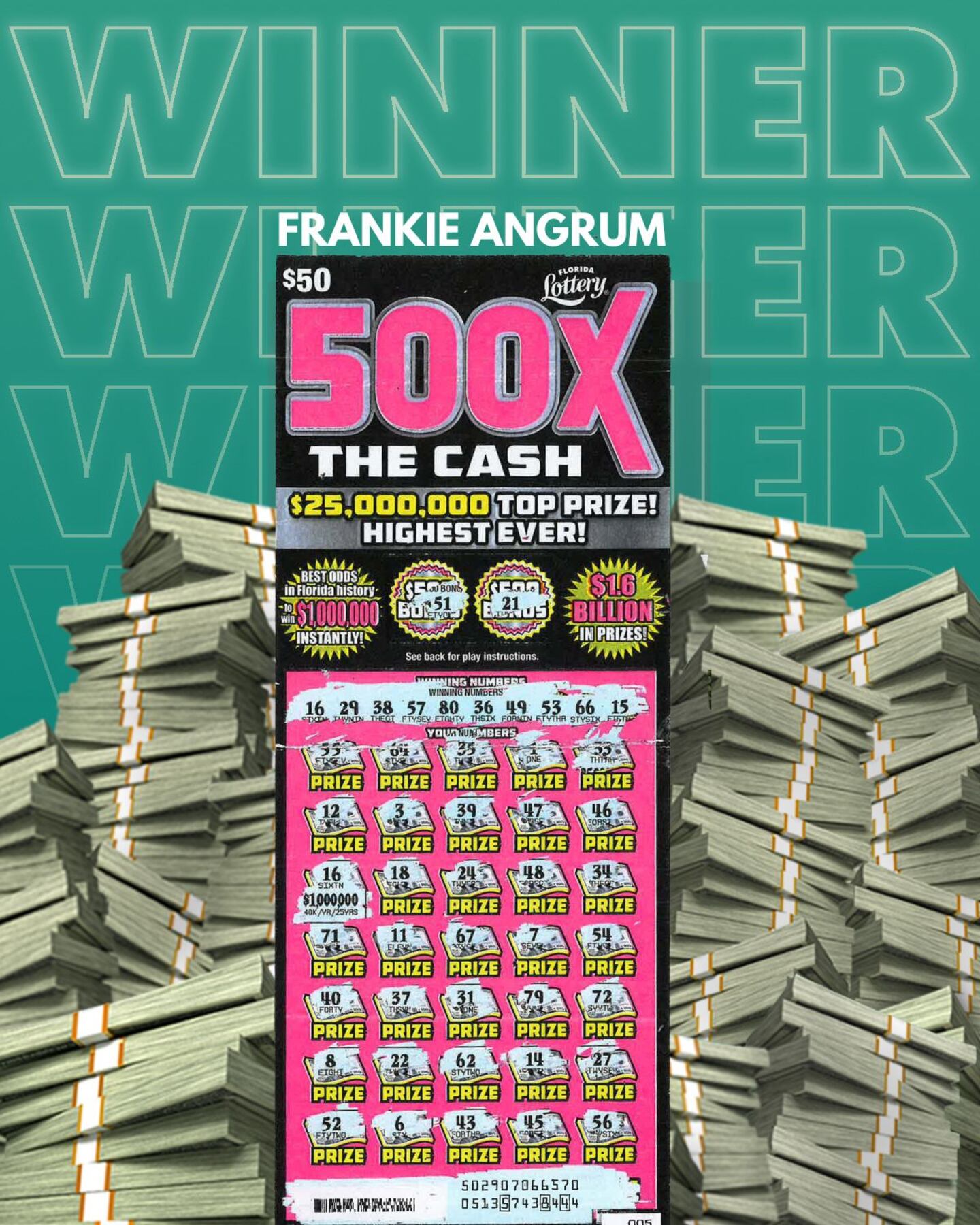 The $50 game, 500X THE CASH, features a top prize of $25 million - the largest ever offered on a Florida Lotto Scratch-Off game - and the best odds to become an instant millionaire!