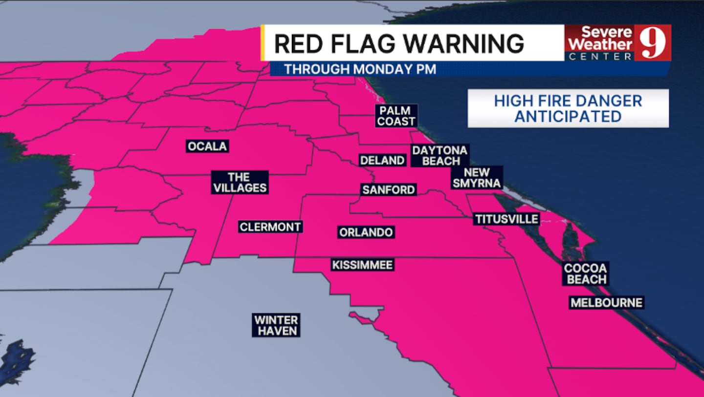 A Red Flag Warning continues for the majority of Central Florida this evening and again on Monday.
