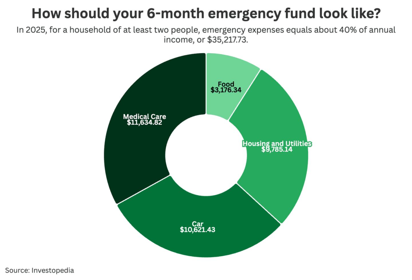 In 2025, a six-month emergency fund for a two-person household totals around $35,218, or 40% of the average annual income, per Investopedia. The chart above breaks down the key costs — housing, food, healthcare — that make up this savings goal. The methodology for this data comes from sources such as KFF, the Bureau of Transportation Statistics, the American Communities Survey, and the Consumer Expenditure Survey.