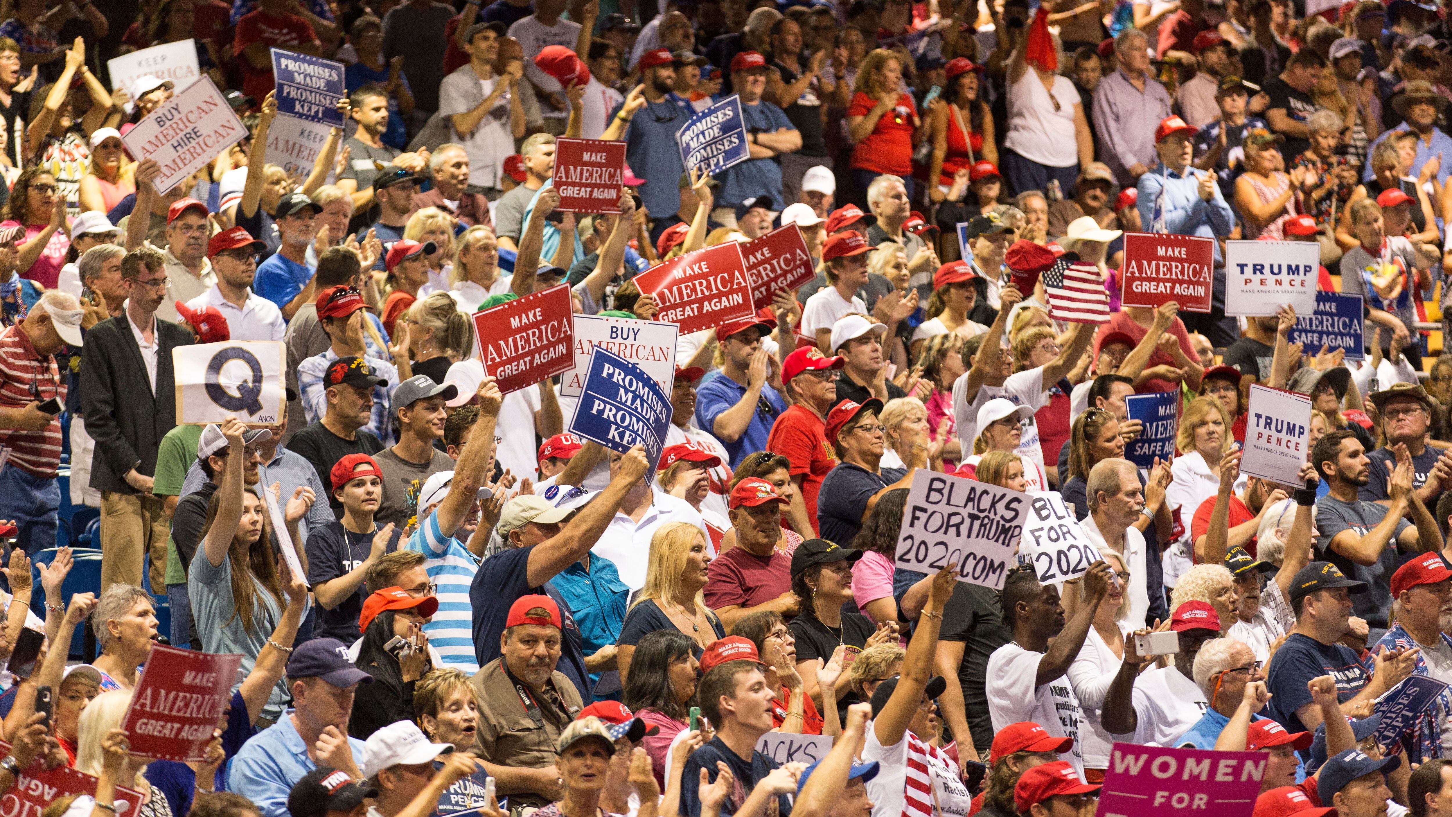 Inside Florida State Fairgrounds' Expo Hall Tuesday night, Q posters and shirts peppered the crowd chanting "fake news" and "build the wall." While QAnon followers have been a part of public events in the past, this sighting is making QAnon more mainstream. It was the group's "real coming-out party," Washington Post columnist Margaret Sullivan notes.