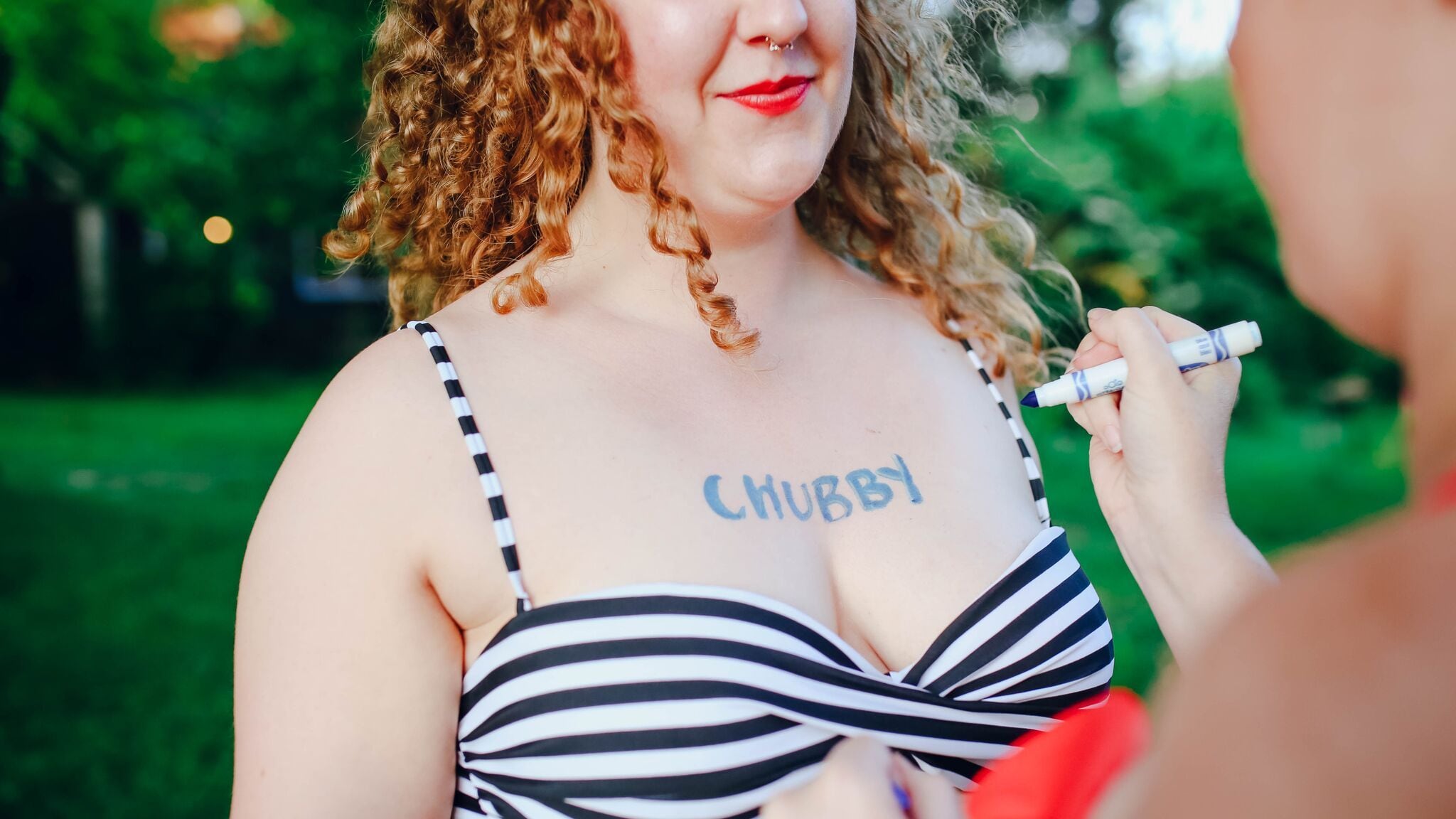 The blond in the red bikini did as she was told — she wrote "Chubby" in marker on her friend, Kenna Sisson's, chest.