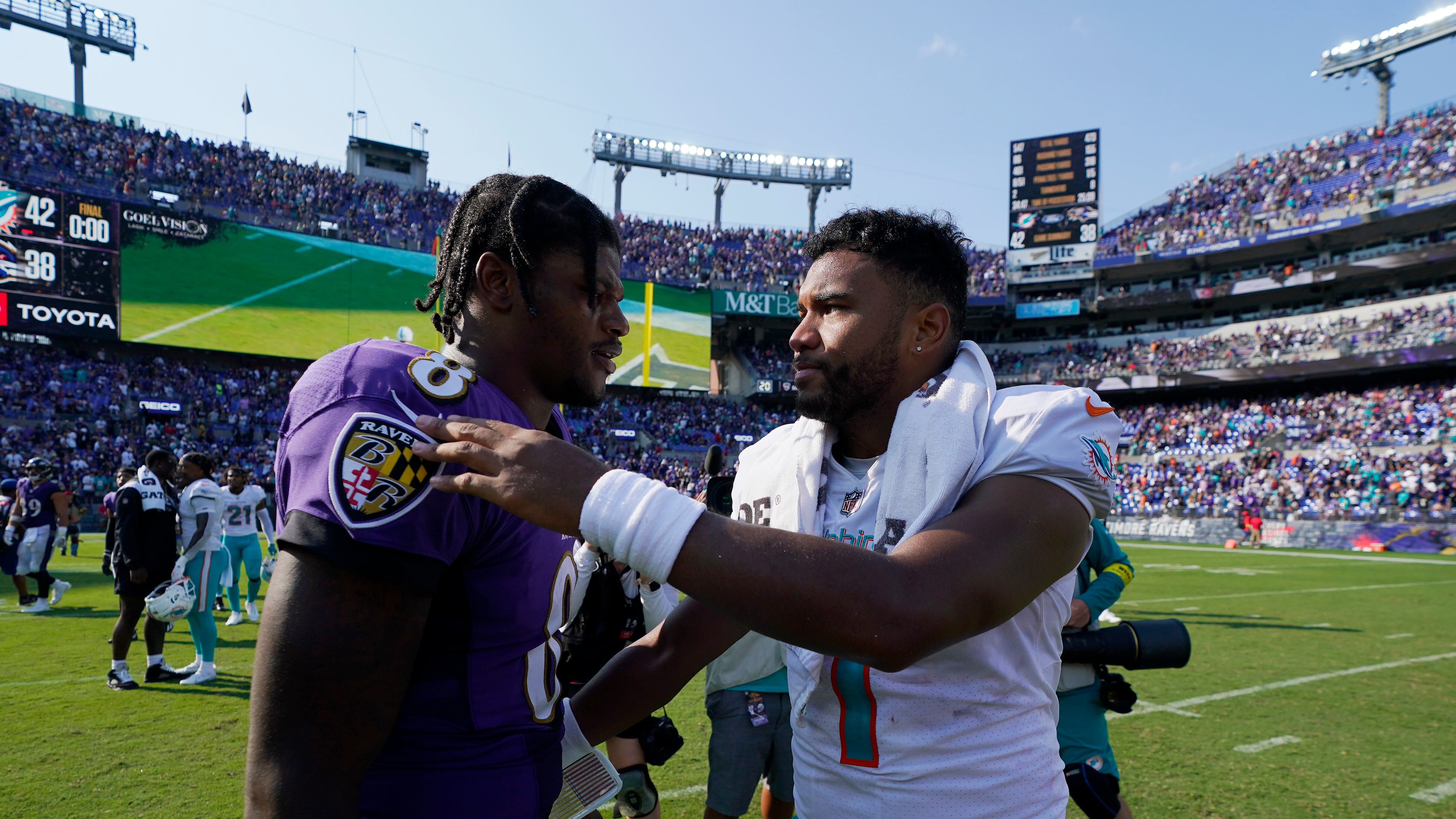 Jackson’s game is a mix of throwing and running, and he did both things well Sunday. He’s certainly not the reason Baltimore lost. Jackson completed 21-of-29 passes for 318 yards and three touchdowns, and he added a 79-yard touchdown run. The Ravens had 473 yards of total offense, and 437 of those yards were routed through their franchise quarterback. And like Tagovailoa, Jackson knew where to steer the ball — Rashod Bateman (4-108-1) and Mark Andrews (9-104-1) absorbed nearly two-thirds of the targets and were open all afternoon.