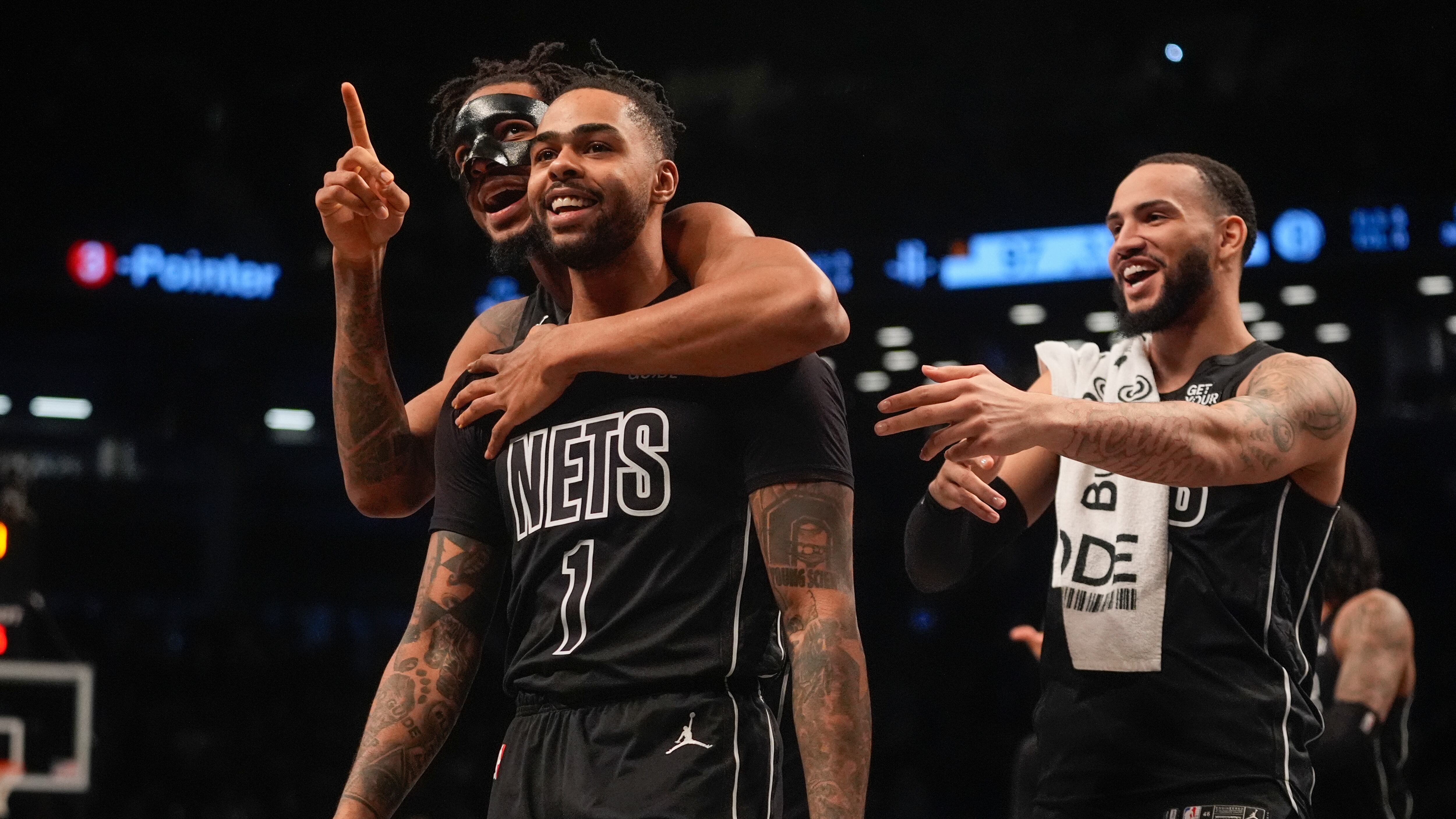 Brooklyn Nets' D'Angelo Russell (1) celebrates with teamamtes after making a three-point shot during the second half of an NBA basketball game against the Houston Rockets Tuesday, Feb. 4, 2025, in New York. (AP Photo/Frank Franklin II) (Frank Franklin II/AP)