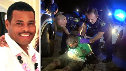 Ronald Greene death: A video still from a Louisiana state trooper's body camera shows shows troopers holding up Ronald Greene before paramedics arrive May 10, 2019, outside of Monroe, La. The footage shows troopers stunning and beating Greene, 49, who died on the way to a hospital. (Family photo via AP, Louisiana State Police via AP)