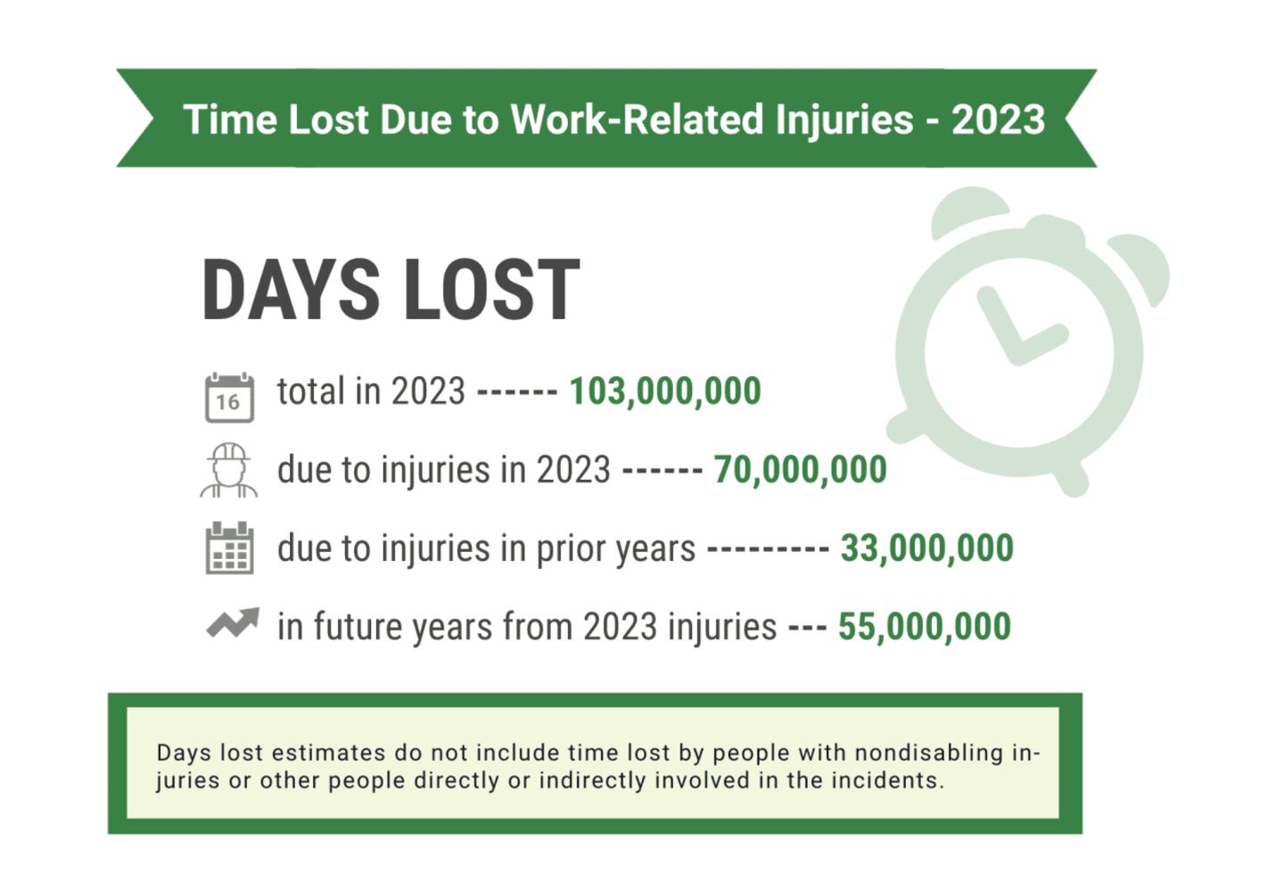 - Lost productivity. Time lost when injured workers can't perform. In 2023, this was about 103,000,000 days of lost work in total after an injury at work.