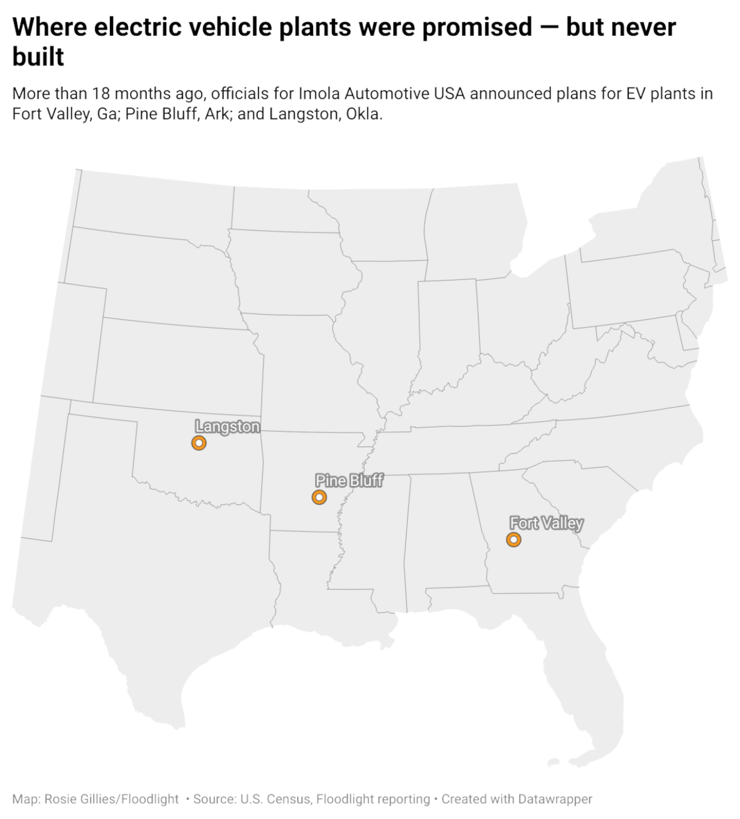 Imola Automotive USA, a Boca Raton, Florida-based startup, pitched officials in small, struggling towns in Georgia, Oklahoma, and Arkansas on a bold vision. The company planned to build six EV plants, create 45,000 jobs — and help these impoverished communities secure a place in America's green future, Floodlight reports.