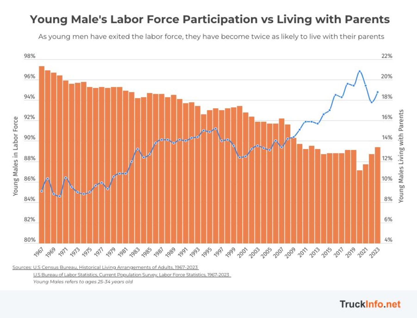 Since 1967, men have steadily exited the labor force and increasingly started living with their parents—suggesting a decrease in job stability and earnings opportunities have negatively impacted men “leaving the nest.”
