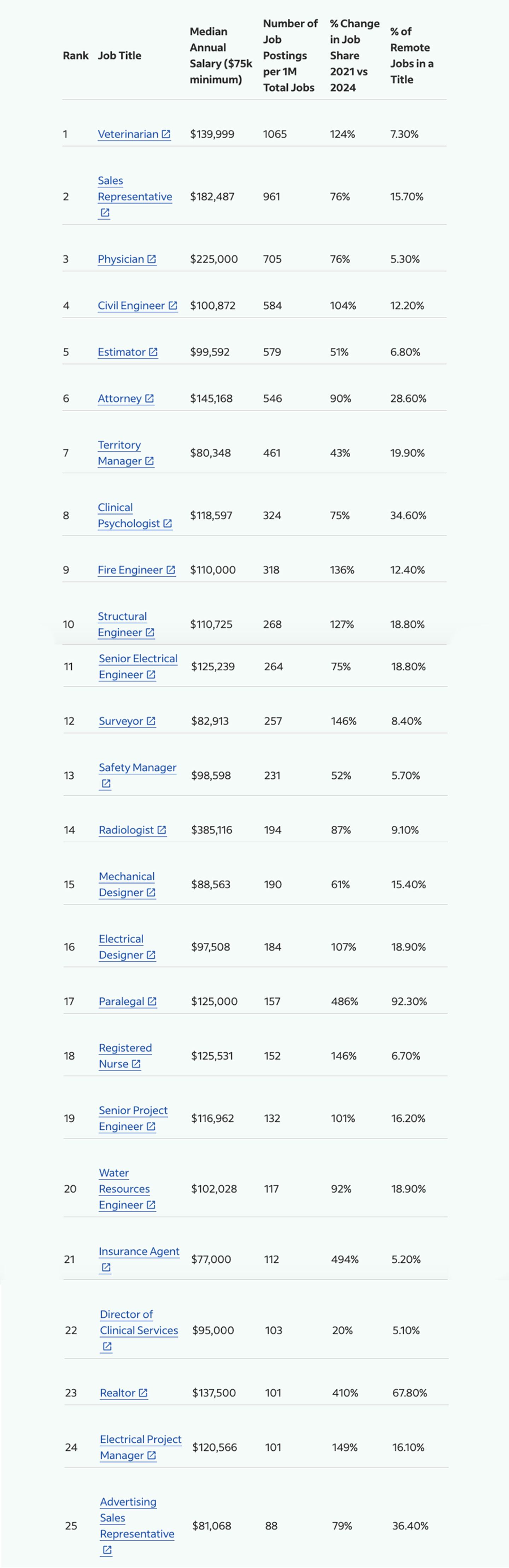 This list was compiled using a data-driven approach, focusing on roles that offer high salaries, sustained growth and flexibility. The methodology analyzes jobs on Indeed that meet three key criteria: a minimum salary of $75,000, at least 20% growth in postings over the past three years, and at least 5% of postings are remote or hybrid. These jobs are then ranked by their share of postings on Indeed.