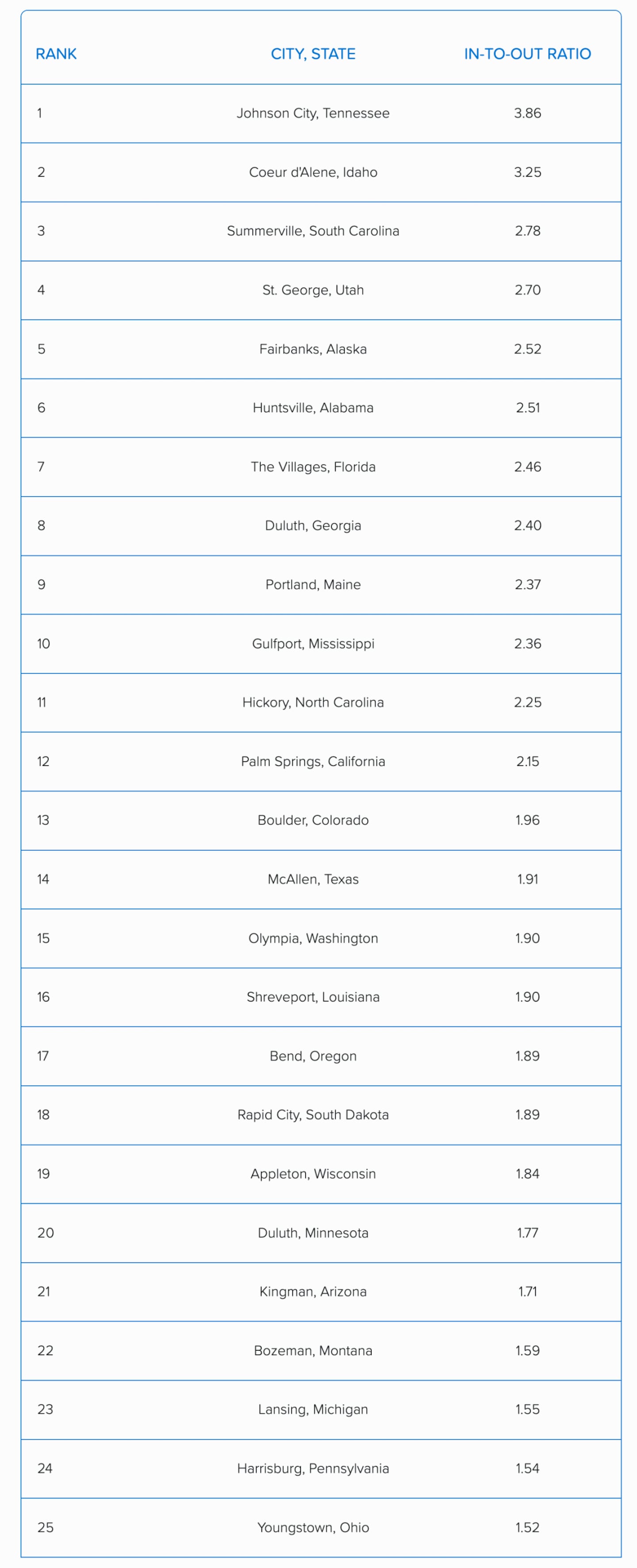 There were four states that didn't have a single city in the dataset with an in-to-out ratio greater than "1" meaning there was not technically a top "move to" city according to mover search data. These cities, instead, were the least "moved out" of cities in their state:
