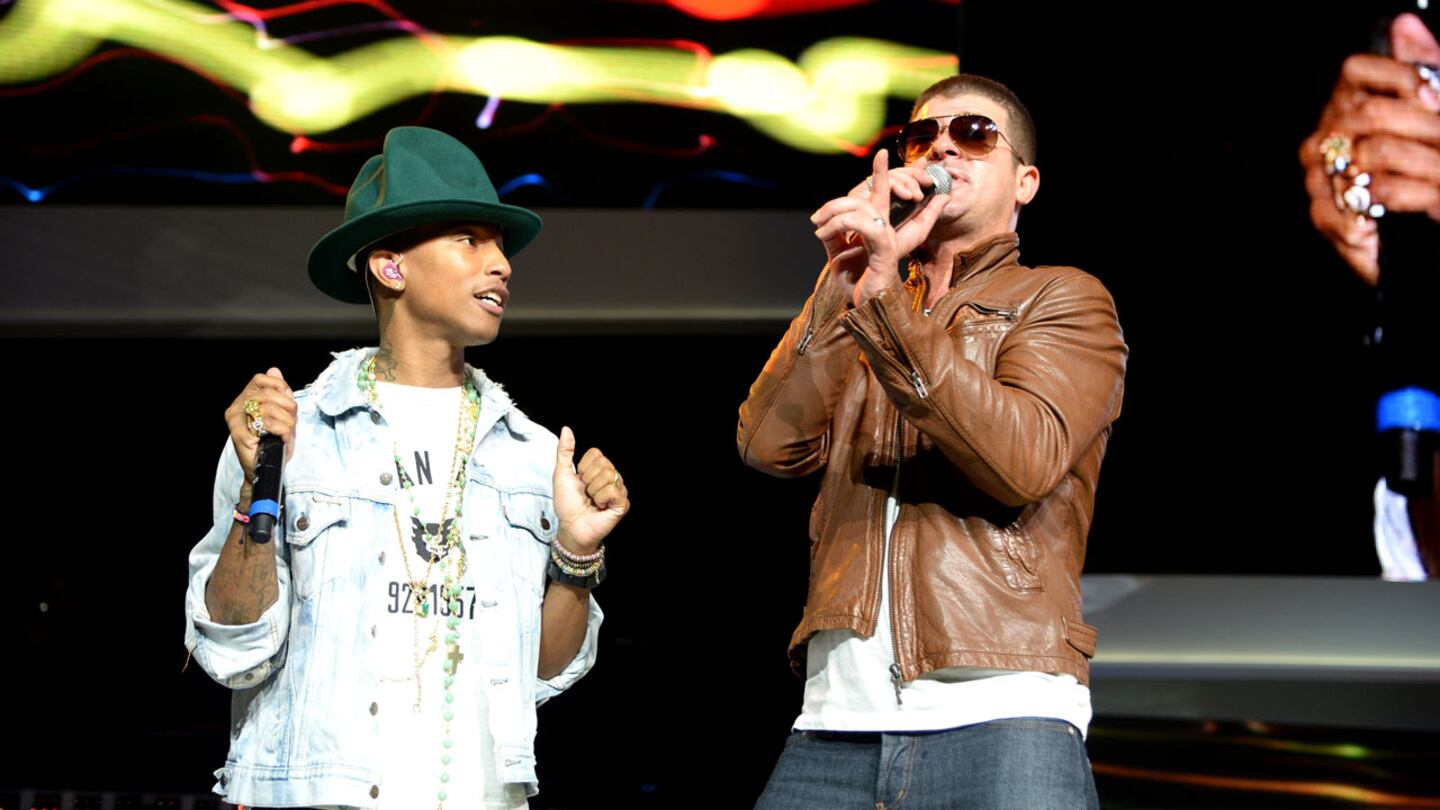 Pharrell Williams and Robin Thicke perform. They both have to pay the family of Marvin Gaye over copyright infringement connected to their song, "Blurred Lines." Photo: Jamie McCarthy/Getty Images for Walmart