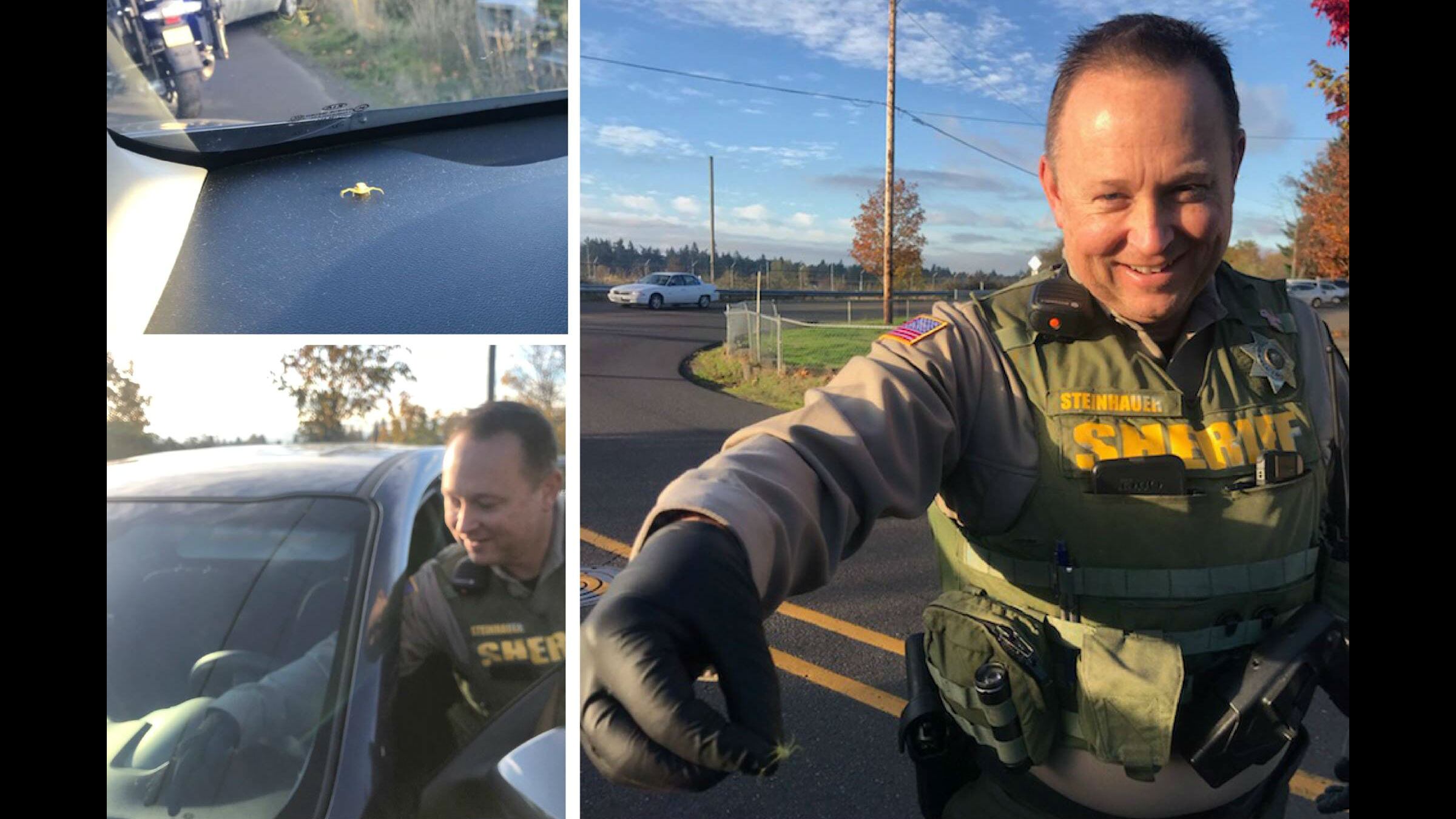 CLACKAMAS COUNTY, Ore. — An Oregon sheriff’s deputy is a hero, at least to one woman who was paralyzed with fear after finding a creepy yellow spider on her car’s dashboard.