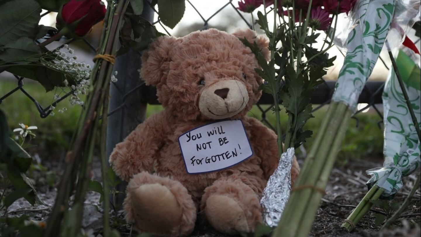 A teddy bear is seen in a makeshift memorial setup in front of Marjory Stoneman Douglas High School on February 18, 2018 in Parkland, Florida. Police arrested and charged 19 year old former student Nikolas Cruz for the February 14 shooting that killed 17 people. (Photo by Joe Raedle/Getty Images)
