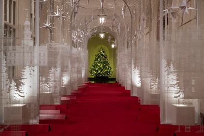 The Cross Hall leading into the State Dining Room is decorated during the 2019 Christmas preview at the White House, Monday, Dec. 2, 2019, in Washington. (AP Photo/Alex Brandon)