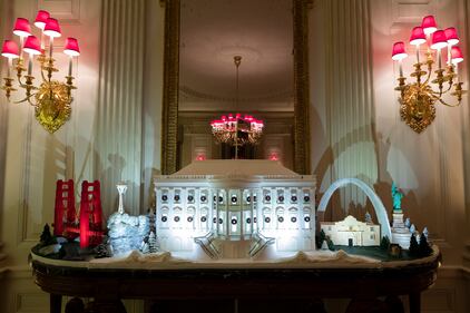 A White House made of gingerbread also features landmarks from around the country in the State Dinning Room during the 2019 Christmas preview at the White House, Monday, Dec. 2, 2019, in Washington. (AP Photo/Alex Brandon)