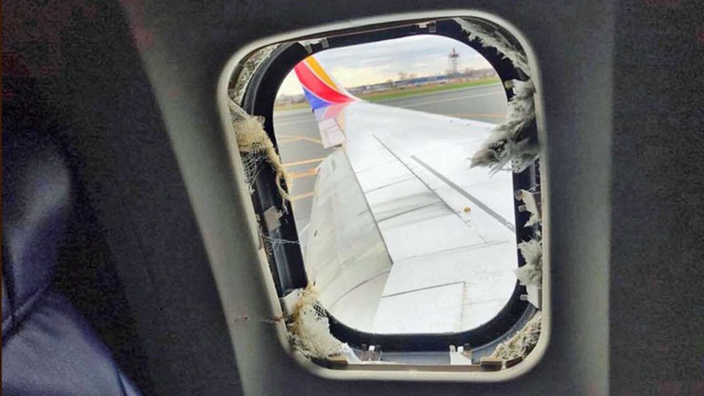 This April 17, 2018 photo provided by Marty Martinez shows the window that was shattered after a jet engine of a Southwest Airlines airplane blew out at altitude, resulting in the death of a woman who was nearly sucked from the window during the flight of the Boeing 737 bound from New York to Dallas with 149 people aboard, shown after it made an emergency landing in Philadelphia. (Marty Martinez/AP)