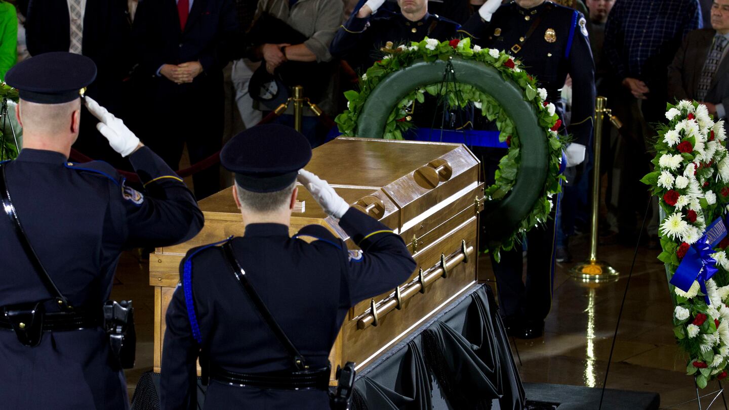 President Donald Trump and First Lady Melania Trump, Vice President Mike Pence and Second Lady Karen Pence, Supreme Court Associate Justices Neil Gorsuch and Samuel Alito Jr. and a slew of Congressional leaders were among the dignitaries paying respects during a ceremony this week, and a military honor guard is in place.