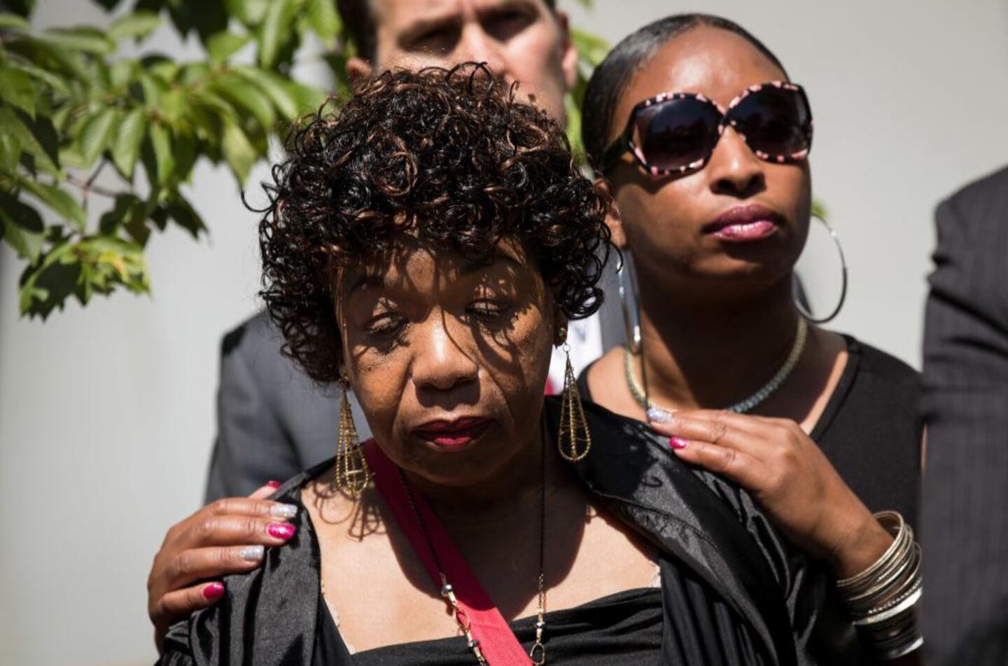 Gwen Carr, mother of the late Eric Garner, is consoled by Ellisha Garner during a press conference after meeting with Department of Justice officials, June 21, 2017 in the Brooklyn borough of New York City. The family was expected to receive a status report on the progress of the civil rights investigation into Eric Garner's police-involved choking death.