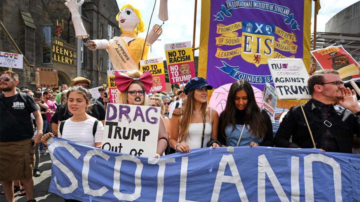 Protesters also greeted Trump in Scotland on Saturday.