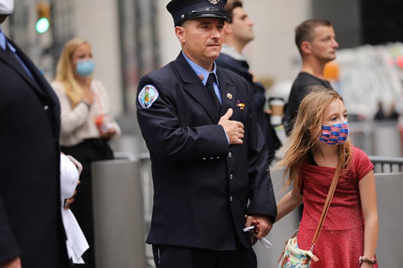 9/11 anniversary NEW YORK, NEW YORK - SEPTEMBER 11: A firefighter holds a young girl's hand as people pause across from One World Trade Center, the Freedom Tower, in lower Manhattan during commemoration ceremonies for the September 11, 2001 terror attacks on September 11, 2020 in New York City. Hundreds of people have gathered for the 19th anniversary of the event at Ground Zero to remember the nearly 3,000 who were killed on that day. But this year, due to COVID-19 pandemic restrictions, only family members are allowed to gather at the 9/11 Memorial plaza. There will also not be an in-person reading of the victims’ names at the memorial and instead there will be a pre-recording of names by family members broadcast throughout the plaza and live-streamed online. (Photo by Spencer Platt/Getty Images) (Spencer Platt/Getty Images)