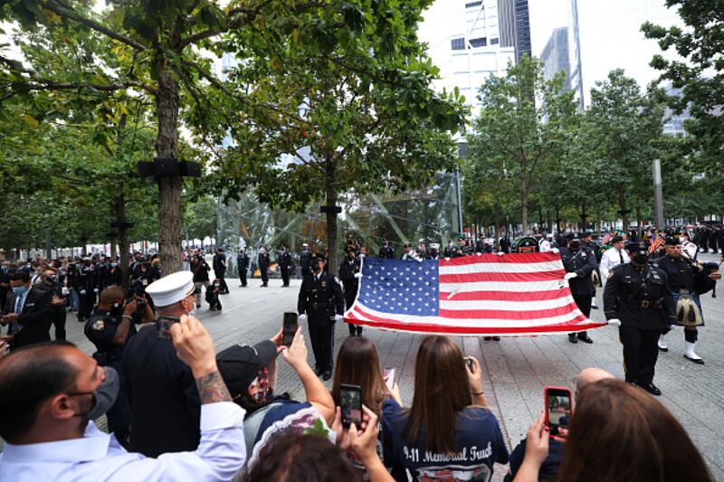 9/11 anniversary NEW YORK, NEW YORK - SEPTEMBER 11: Firefighters stretch out an American Flag as bagpipers play a song during a 9/11 memorial service at the National September 11 Memorial and Museum on September 11, 2020 in New York City. The ceremony to remember those who were killed in the terror attacks 19 years ago will be altered this year in order to adhere to safety precautions around COVID-19 transmission. (Photo by Michael M. Santiago/Getty Images) (Michael M Santiago/GettyImages/Getty Images)