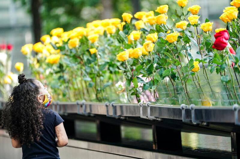 9/11 anniversary Mourners pause at the north reflecting pool as flowers are placed in the names of the dead at the National September 11 Memorial and Museum, Friday, Sept. 11, 2020, in New York. Americans are commemorating 9/11 as a new national crisis in the form of the coronavirus pandemic reconfigures and divides anniversary ceremonies and a presidential campaign carves a path through the observances. (AP Photo/John Minchillo) (John Minchillo/AP)