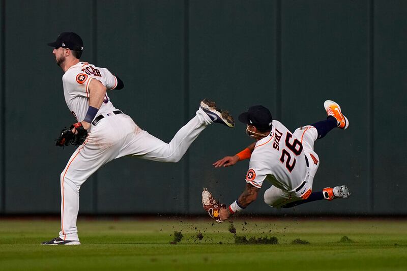 Atlanta Braves win 2021 World Series HOUSTON, TX - NOVEMBER 02: Kyle Tucker #30 and Jose Siri #26 of the Houston Astros collide after Tucker makes a running catch in the eighth inning during Game 6 of the 2021 World Series between the Atlanta Braves and the Houston Astros at Minute Maid Park on Tuesday, November 2, 2021 in Houston, Texas. (Photo by Daniel Shirey/MLB Photos via Getty Images) (Daniel Shirey/MLB Photos via Getty Images)
