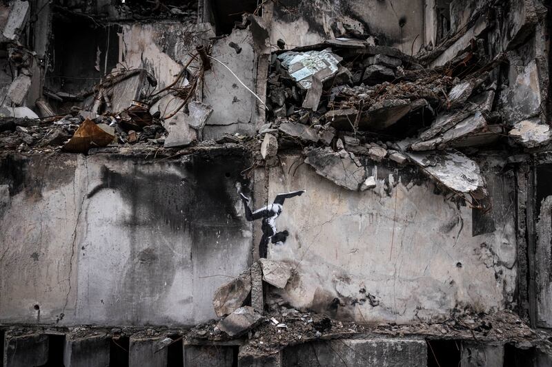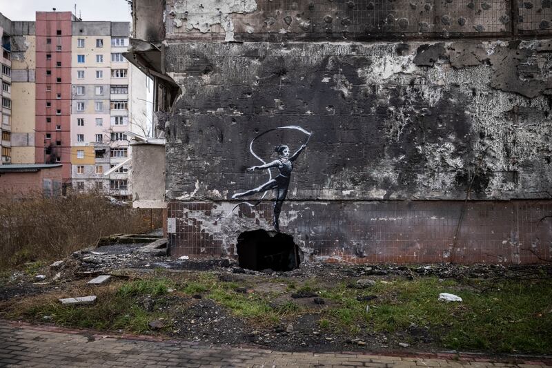 Key Infrastructure Attacked, Leaving Kyiv With Further Power And Water Outages IRPIN, UKRAINE - NOVEMBER 11 Graffiti of a woman in a leotard and a neck brace waving a ribbon is seen on the wall of a destroyed building in Irpin on November 11, 2022 in Kyiv Region, Ukraine. Similar art work in the region sparked online speculation over whether the graffiti artist Banksy has been working in Ukraine. Irpin saw heavy fighting in the first few weeks of the conflict. Electricity and heating outages across Ukraine caused by missile and drone strikes to energy infrastructure have added urgency to preparations for winter. (Photo by Ed Ram/Getty Images) (Ed Ram/Getty Images)