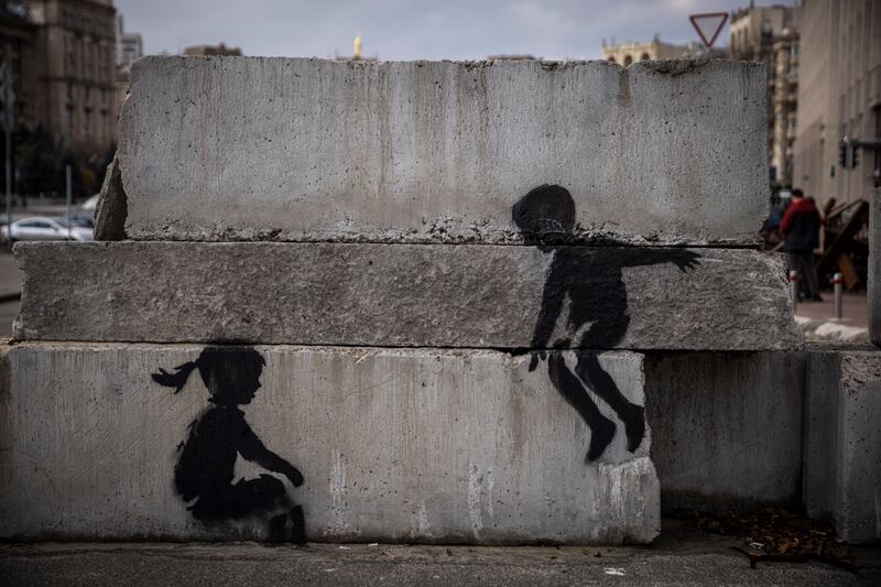 Key Infrastructure Attacked, Leaving Kyiv With Further Power And Water Outages KVIY, UKRAINE - NOVEMBER 12: Street art of two children is painted on blocks of concrete in Independence Square on November 12th 2022 in Kyiv Region, Ukraine. A military roadblock made of steel girders, often referred to as hedgehogs, used to sit between the children, giving the appearance that the children were playing on a seesaw. On November 11 2022, the artist Banksy announced that he had made similar art work in Borodyanka, also in Kyiv region. Electricity and heating outages across Ukraine caused by missile and drone strikes to energy infrastructure have added urgency to preparations for winter. (Photo by Ed Ram/Getty Images) (Ed Ram/Getty Images)