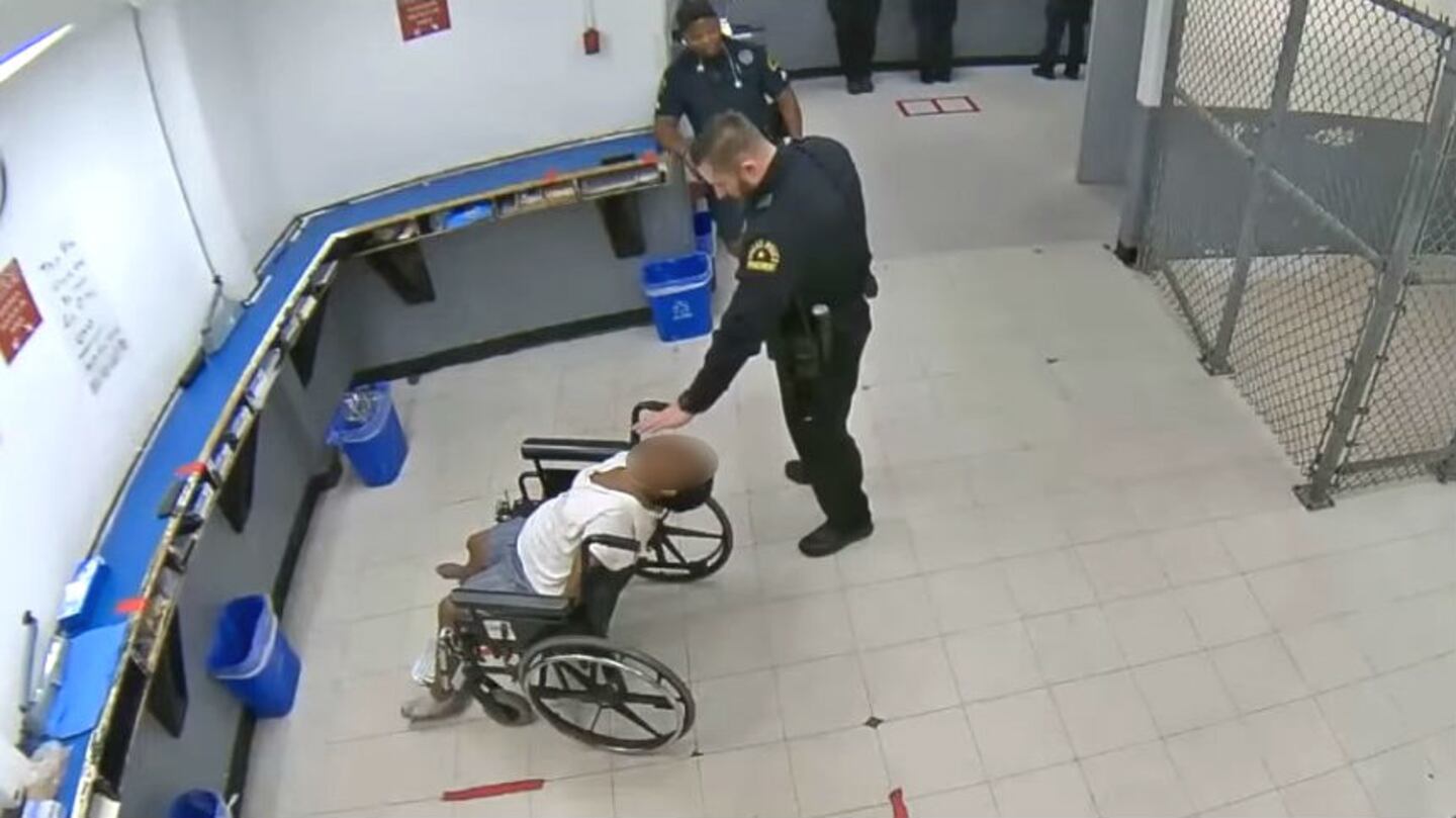 The footage from inside the jail, which has no audio, shows the officers drag Ross into a holding cell made of chain-link fencing. Ortega retrieves a wheelchair.