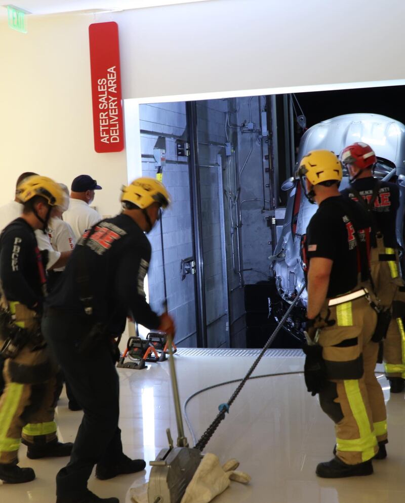 Palm Beach County Fire Rescue was initially called to Ferrari of Palm Beach for a reported structure fire, WPTV reported. However, when crews arrived, they found a car hanging upside down in an elevator shaft instead of a fire.