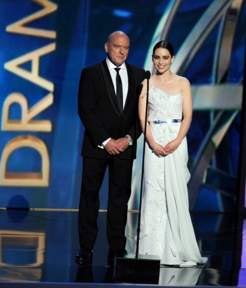 Photos: Emilia Clarke through the years 2013: Actor Dean Norris and actress Emilia Clarke speak onstage during the 65th annual Primetime Emmy Awards held at Nokia Theatre L.A. Live on September 22, 2013, in Los Angeles. (Kevin Winter/Getty Images)