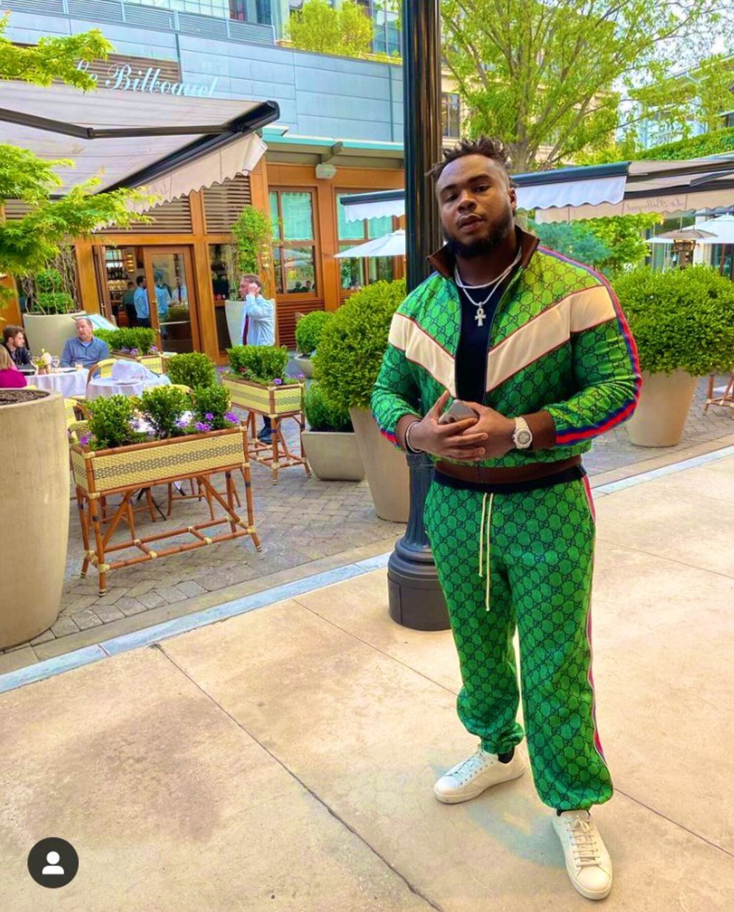 Jarrett’s since-deleted Instagram post featured a photo of him in a green jumpsuit. The caption said: “Not sure if I know how my dress is offensive, maybe it’s the Gucci suit, the Bussdown AP Offshore, the iced double tennis chain w an Ankh and the fact that I pulled up in my 500k RR and they felt I wasn’t fit to bless their restaurant for dinner.. I guess the other people rocking Nike sweat suits and t shirts that were already seated (as you can see in the background of the picture) n enjoying dinner were no problem.”