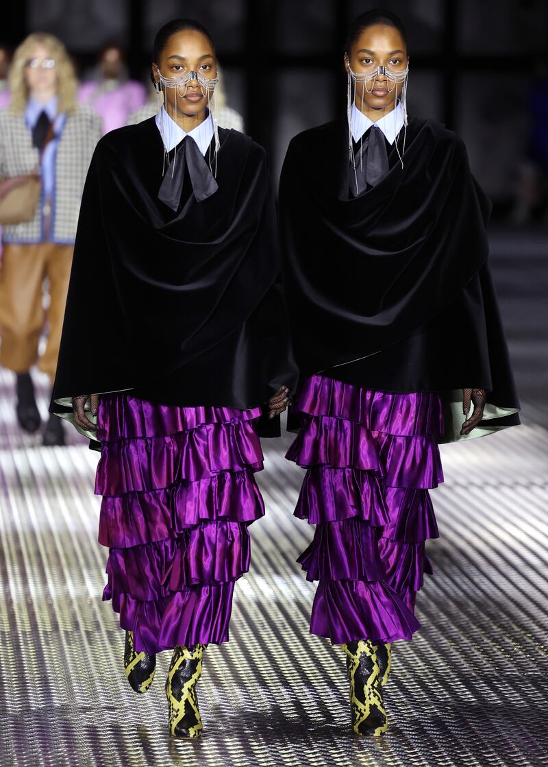Michele, Gucci’s creative director, had a stage constructed with a secret reveal. According to The Associated Press, he staged side-by-side shows inside the Gucci Hub, each unbeknownst to the other, until a wall lifted, revealing sets of twins in similar looks in synchronic stride.