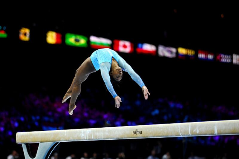 2023 Artistic Gymnastics World Championships ANTWERP, BELGIUM - OCTOBER 01: Simone Biles of the Team United States competes on Balance Beam during Women's Qualifications on Day Two of the FIG Artistic Gymnastics World Championships at the Antwerp Sportpaleis on October 01, 2023 in Antwerp, Belgium. (Photo by Matthias Hangst/Getty Images) (Matthias Hangst/Getty Images)