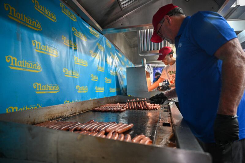 Nathan's Annual Hot Dog Eating Contest NEW YORK, NEW YORK - JULY 04: Nathan's Famous workers prepare hot dogs for the men's competition during the 2023 Nathan's Famous Fourth of July International Hot Dog Eating Contest on July 4, 2023 at Coney Island in the Brooklyn borough of New York City. The annual contest, which began in 1972, draws thousands of spectators to Nathan’s Famous located on Surf Avenue. (Photo by Alexi J. Rosenfeld/Getty Images) (Alexi Rosenfeld/Getty Images)