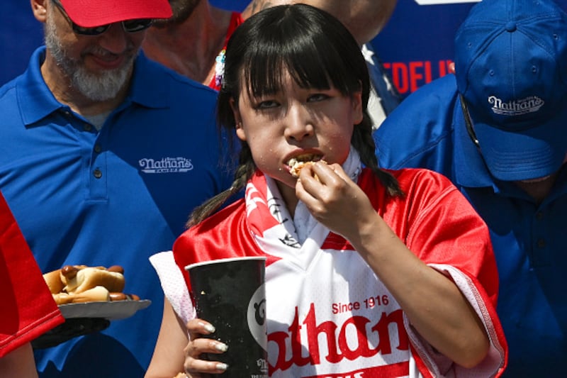 Nathan's Annual Hot Dog Eating Contest NEW YORK, NEW YORK - JULY 04: Mayoi Ebihara competes during the 2023 Nathan's Famous Fourth of July International Hot Dog Eating Contest at Coney Island on July 04, 2023 in the Brooklyn borough of New York City. The annual contest, which began in 1972, draws thousands of spectators to Nathan’s Famous located on Surf Avenue. (Photo by Alexi J. Rosenfeld/Getty Images) (Alexi Rosenfeld/Getty Images)