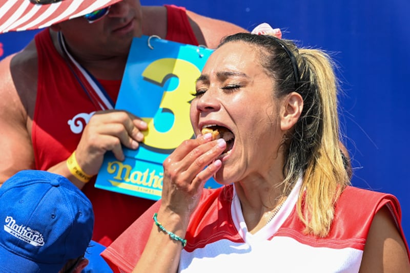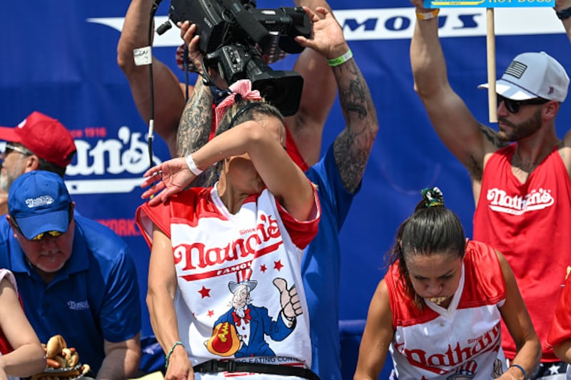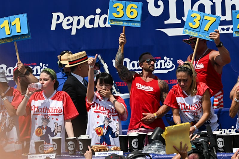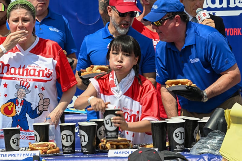 Nathan's Annual Hot Dog Eating Contest NEW YORK, NEW YORK - JULY 04: Mayoi Ebihara (C) competes during the 2023 Nathan's Famous Fourth of July International Hot Dog Eating Contest at Coney Island on July 04, 2023 in the Brooklyn borough of New York City. The annual contest, which began in 1972, draws thousands of spectators to Nathan’s Famous located on Surf Avenue. (Photo by Alexi J. Rosenfeld/Getty Images) (Alexi Rosenfeld/Getty Images)