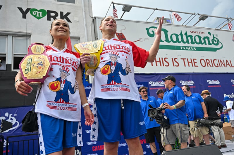 Nathan's Annual Hot Dog Eating Contest NEW YORK, NEW YORK - JULY 04: Women's winner Miki Sudo (L) and men's winner Joey Chestnut (R) pose after coming in first place during the 2023 Nathan's Famous Fourth of July International Hot Dog Eating Contest on July 4, 2023 at Coney Island in the Brooklyn borough of New York City. The annual contest, which began in 1972, draws thousands of spectators to Nathan’s Famous located on Surf Avenue. (Photo by Alexi J. Rosenfeld/Getty Images) (Alexi Rosenfeld/Getty Images)