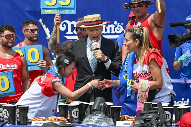 Nathan's Annual Hot Dog Eating Contest NEW YORK, NEW YORK - JULY 04: Mayoi Ebihara (L) shakes hands with defending champion Miki Sudo during the 2023 Nathan's Famous Fourth of July International Hot Dog Eating Contest at Coney Island on July 04, 2023 in the Brooklyn borough of New York City. The annual contest, which began in 1972, draws thousands of spectators to Nathan’s Famous located on Surf Avenue. (Photo by Alexi J. Rosenfeld/Getty Images) (Alexi Rosenfeld/Getty Images)