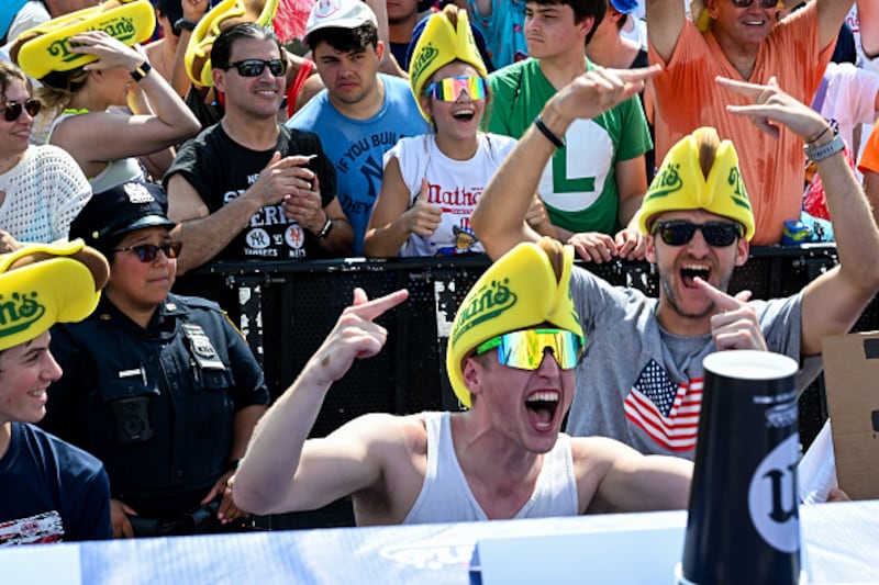 Nathan's Annual Hot Dog Eating Contest NEW YORK, NEW YORK - JULY 04: Spectators cheer during the 2023 Nathan's Famous Fourth of July International Hot Dog Eating Contest at Coney Island on July 04, 2023 in the Brooklyn borough of New York City. The annual contest, which began in 1972, draws thousands of spectators to Nathan’s Famous located on Surf Avenue. (Photo by Alexi J. Rosenfeld/Getty Images) (Alexi Rosenfeld/Getty Images)