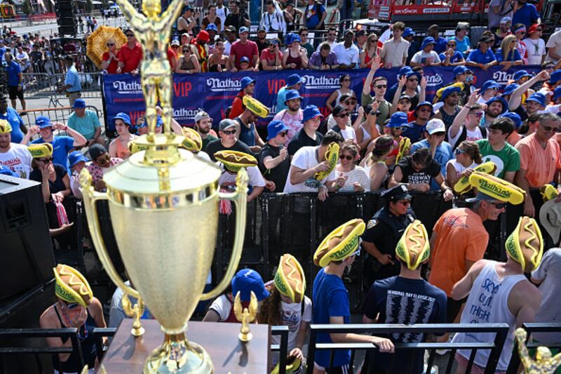 Nathan's Annual Hot Dog Eating Contest NEW YORK, NEW YORK - JULY 04: Spectators look on ahead of the 2023 Nathan's Famous Fourth of July International Hot Dog Eating Contest at Coney Island on July 04, 2023 in the Brooklyn borough of New York City. The annual contest, which began in 1972, draws thousands of spectators to Nathan’s Famous located on Surf Avenue. (Photo by Alexi J. Rosenfeld/Getty Images) (Alexi Rosenfeld/Getty Images)