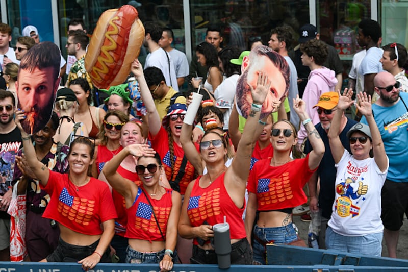 Nathan's Annual Hot Dog Eating Contest NEW YORK, NEW YORK - JULY 04: Spectators cheer ahead of the 2023 Nathan's Famous Fourth of July International Hot Dog Eating Contest at Coney Island on July 04, 2023 in the Brooklyn borough of New York City. The annual contest, which began in 1972, draws thousands of spectators to Nathan’s Famous located on Surf Avenue. (Photo by Alexi J. Rosenfeld/Getty Images) (Alexi Rosenfeld/Getty Images)
