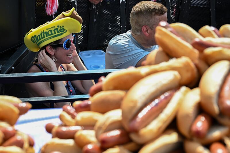 Nathan's Annual Hot Dog Eating Contest NEW YORK, NEW YORK - JULY 04: Hot dogs are placed on the competition table ahead of the 2023 Nathan's Famous Fourth of July International Hot Dog Eating Contest at Coney Island on July 04, 2023 in the Brooklyn borough of New York City. The annual contest, which began in 1972, draws thousands of spectators to Nathan’s Famous located on Surf Avenue. (Photo by Alexi J. Rosenfeld/Getty Images) (Alexi Rosenfeld/Getty Images)