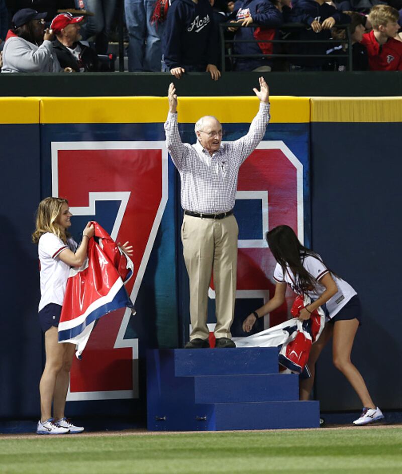 Photos: Vince Dooley through the years 2016: Former University of Georgia head coach and athletic director Vince Dooley unveils the banner for 79 games remaining at Turner Field during the game between the Atlanta Braves and the Washington Nationals at Turner Field on April 6, 2016, in Atlanta. (Mike Zarrilli/Getty Images)