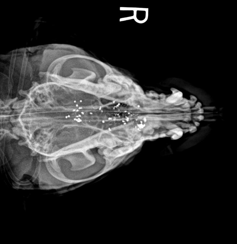 Arthur the corgi rescued after being shot in the head X-ray showing bullet fragments in Arthur's head. (PSPCA)