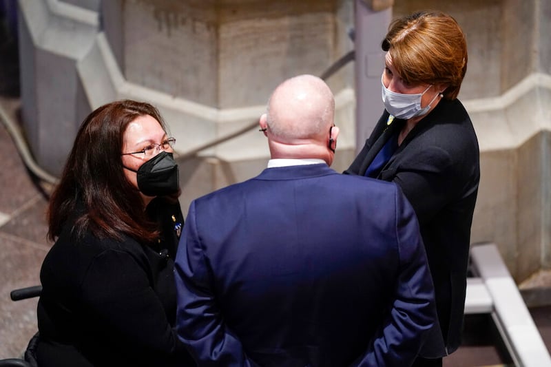 Remembering Madeleine Albright Sen. Tammy Duckworth, D-Ill., left, and Sen. Amy Klobuchar, D-Minn., right, arrive for a funeral service for former Secretary of State Madeleine Albright at National Cathedral, Wednesday, April 27, 2022, in Washington. (AP Photo/Andrew Harnik) (Andrew Harnik/AP)